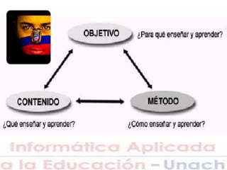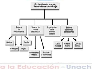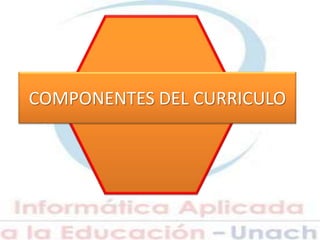 Este documento describe los componentes básicos del currículo educativo, incluyendo qué enseñar, cuándo enseñar, cómo enseñar y cómo evaluar. Explica que estos componentes responden a los objetivos, contenidos, ordenación y evaluación de la enseñanza. Además, detalla que el contenido curricular incluye conocimientos, habilidades, hábitos y valores que los estudiantes deben apropiar, y cumple funciones instructivas, educativas y de desarrollo.