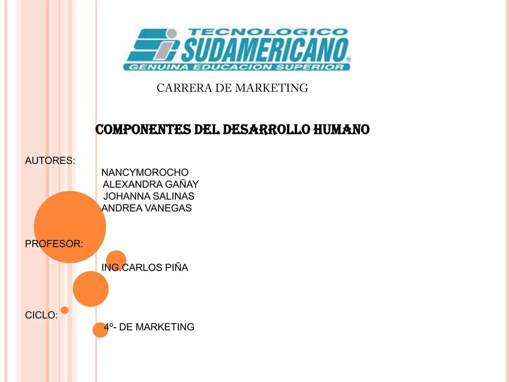 El documento describe una carrera de marketing. Se divide en cuatro componentes del desarrollo humano escritos por cuatro estudiantes y supervisados por un profesor de marketing en el cuarto ciclo.