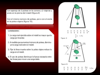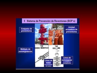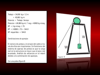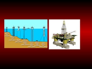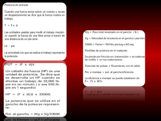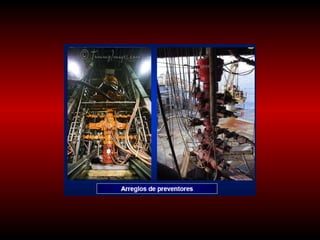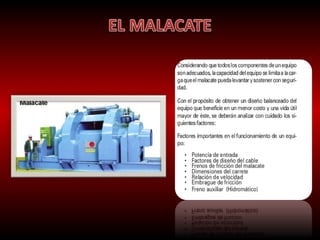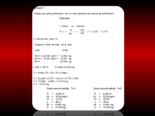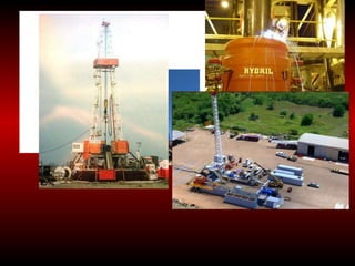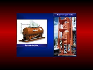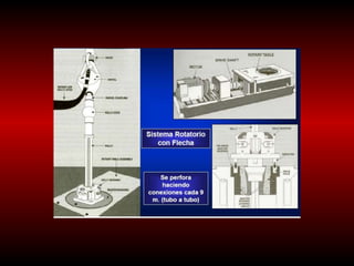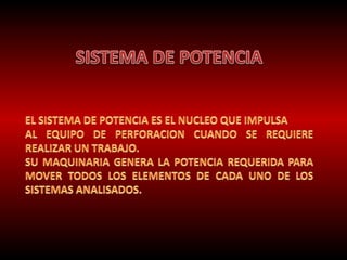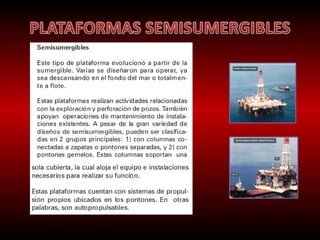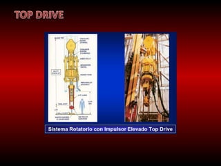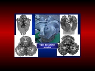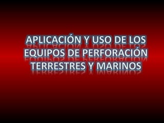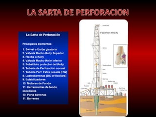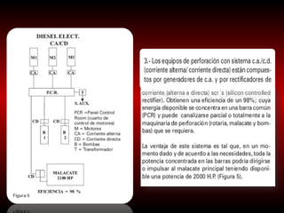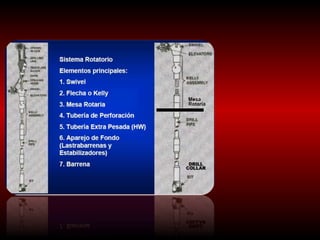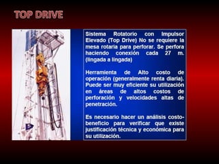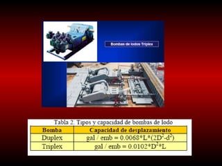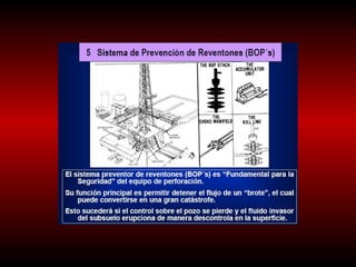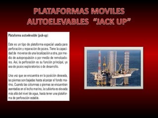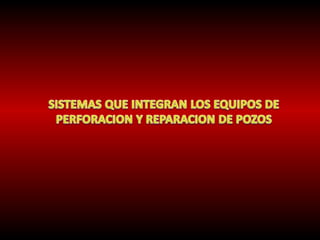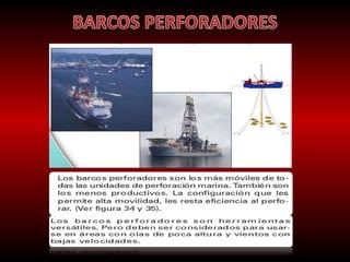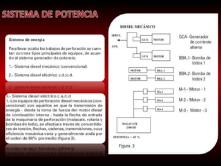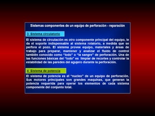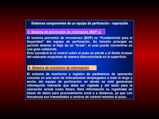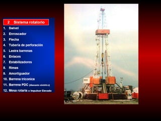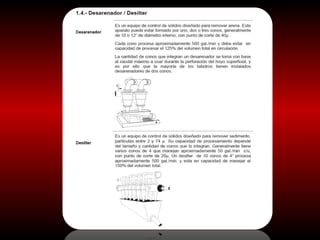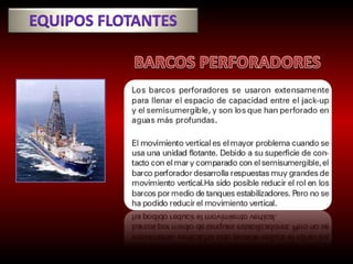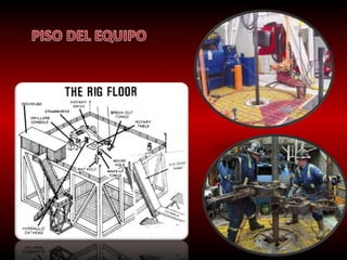 Este documento describe los diferentes tipos de equipos de perforación terrestres y marinos, incluyendo sus componentes y especificaciones. Explica los sistemas clave de un equipo de perforación como la potencia, levantamiento, rotación y circulación de fluidos. Además, proporciona detalles sobre componentes individuales como la corona, polea viajera, gancho y elevadores.