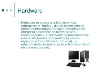 El documento clasifica el hardware de una computadora en básico y complementario. El hardware básico incluye una CPU, memoria RAM, un medio de almacenamiento y entrada/salida de datos. La placa base conecta estos componentes mediante buses. La memoria RAM almacena temporalmente datos e instrucciones para la CPU. Los periféricos permiten la entrada y salida de datos, como teclados, monitores e impresoras. Las tarjetas gráficas cuentan con su propia memoria y GPU para procesar gráficos y liberar a la CPU