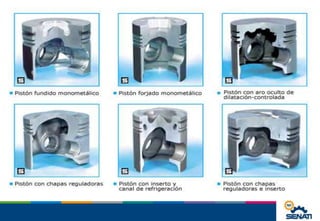 El documento describe los componentes principales de un motor de combustión interna de cuatro tiempos, incluyendo el monoblock, pistones, bielas, cigüeñal, anillos, bulón y camisas. Explica que el monoblock contiene los elementos del conjunto móvil y la distribución, y se fabrica generalmente de hierro fundido u otras aleaciones.