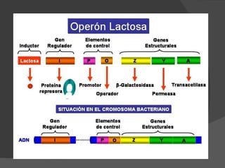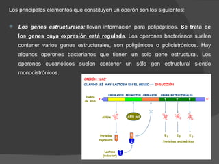 Un operón contiene genes estructurales que codifican polipéptidos, un promotor que inicia la transcripción, un operador reconocido por proteínas reguladoras, y un gen regulador que codifica dichas proteínas. La proteína reguladora se une al operador y controla la expresión de los genes estructurales en respuesta a inductores.