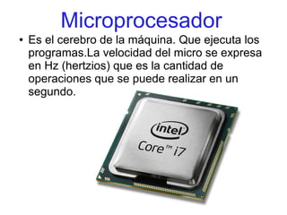 El documento describe los principales componentes de un ordenador, incluyendo el microprocesador que ejecuta los programas, el disco duro que almacena el sistema operativo y archivos, y la memoria RAM que almacena temporalmente los datos y programas en uso. Existen dos tipos de discos duros, mecánicos y SSD, y la RAM es más rápida que otros tipos de almacenamiento pero se borra al apagar el ordenador.