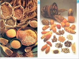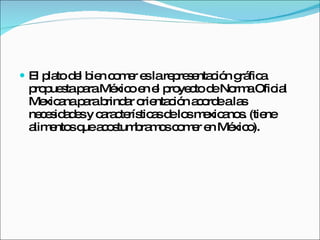 El documento presenta el "Plato del bien comer", la representación gráfica propuesta para la alimentación saludable de los mexicanos. Describe los principales grupos de alimentos que debe incluir una dieta mexicana balanceada: cereales y tubérculos, frutas, verduras, leguminosas y alimentos de origen animal. Proporciona ejemplos de alimentos populares en México que pertenecen a cada grupo y sus beneficios nutricionales.