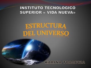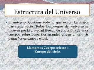 El documento describe la estructura y evolución del universo. Comenzó hace aproximadamente 13.700 millones de años con el Big Bang, donde se formaron elementos livianos. Después de 100 millones de años, la gravedad causó que el gas se juntara para formar las primeras estrellas y galaxias. Las principales estructuras del universo incluyen estrellas, planetas, sistemas solares, galaxias y cúmulos de galaxias, todos los cuales interactúan a través de la gravedad.