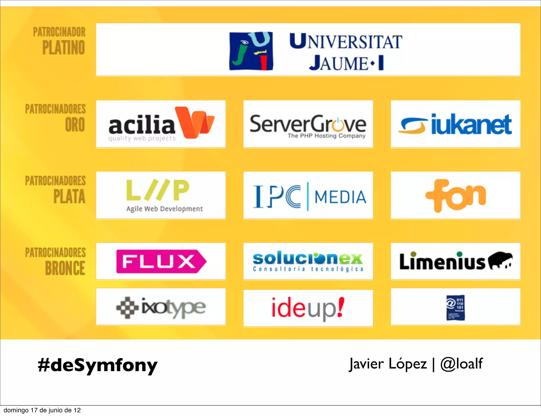 Este documento presenta información sobre Javier López, un desarrollador de Symfony que vive en Londres. Brevemente describe su lugar de nacimiento, lugar de residencia actual, lugar de trabajo y sitios web personales en los que escribe y tuitea.