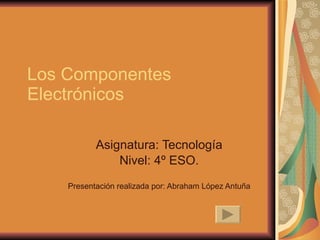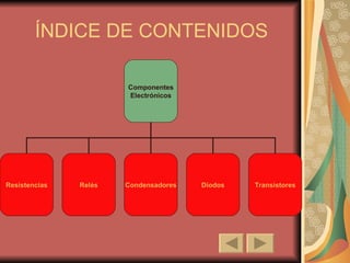 Este documento resume los principales componentes electrónicos como resistencias, condensadores, relés, diodos y transistores. Explica que las resistencias ofrecen oposición al paso de corriente y se identifican por su código de colores. Los condensadores almacenan carga eléctrica entre placas separadas por un dieléctrico. Los relés son interruptores magnéticos que conmutan circuitos. Los diodos permiten paso de corriente en un solo sentido, y los transistores amplifican señales débiles mediante tres terminales.