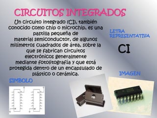 Los circuitos integrados, interruptores, transistores, potenciómetros, fusibles, bobinas, diodos rectificadores, diodos LED, condensadores polarizados, transformadores y resistencias son componentes electrónicos fundamentales utilizados en dispositivos eléctricos y electrónicos. Cada componente cumple una función específica como conducir, interrumpir, almacenar o transformar la corriente eléctrica de acuerdo a sus características.