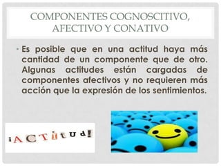 El documento describe los tres componentes de las actitudes: cognitivo, afectivo y conativo. El componente cognitivo se refiere al conocimiento sobre el objeto de la actitud. El componente afectivo es la valoración emocional positiva o negativa. El componente conativo es la tendencia a reaccionar y comportarse de cierta manera hacia el objeto.