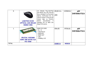 Este documento lista los componentes informáticos necesarios para una tienda de informática, incluyendo un monitor de pantalla plana, una tarjeta gráfica GeForce GTX 650, 3 teclados Logitech K120, 5 ratones ópticos Logitech B100 y una memoria RAM Crucial SODIMM DDR2 de 2GB. También incluye las características y precios de cada artículo así como el total de la compra.