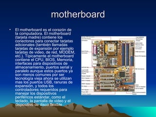 Este documento describe los principales componentes internos de una computadora personal, incluyendo la tarjeta madre (motherboard), la unidad central de procesamiento (CPU), el bios, la memoria RAM, y la tarjeta de video. La tarjeta madre contiene los conectores y controladores para otros dispositivos. El CPU ejecuta los cálculos. El bios controla el inicio del sistema. La RAM es memoria de acceso aleatorio utilizada temporalmente. La tarjeta de video genera la señal de video enviada al monitor.