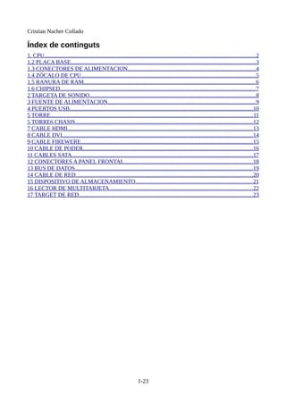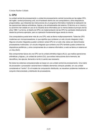 Este documento proporciona una descripción general de varios componentes clave de una computadora, incluyendo la CPU, la placa base, la fuente de alimentación, el zócalo de la CPU, las ranuras de memoria RAM, el chipset, las tarjetas de sonido, y otros dispositivos como cables y lectores. Explica brevemente el propósito y la función de cada uno de estos componentes centrales en el funcionamiento de una computadora.