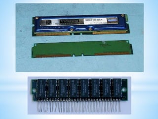 El documento describe diferentes tipos de memoria utilizados en computadoras. Explica que la memoria RAM es volátil y se usa para almacenar instrucciones y datos temporales, mientras que la memoria ROM es de solo lectura y almacena programas fundamentales. También describe discos duros magnéticos, ópticos y memorias de estado sólido como opciones para almacenamiento masivo permanente.