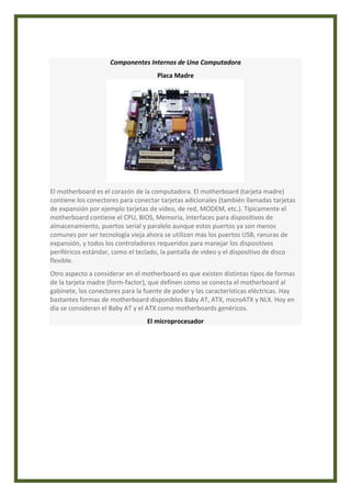 El documento describe los principales componentes internos de una computadora, incluyendo la placa madre, el microprocesador, la memoria RAM y ROM, la memoria caché, la unidad de procesamiento central (CPU), la tarjeta de video, el BIOS y las unidades de almacenamiento como discos duros y unidades flash USB. Explica brevemente las funciones de cada uno de estos componentes clave y cómo trabajan juntos para hacer funcionar una computadora.