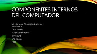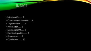El documento describe los principales componentes internos de una computadora, incluyendo la tarjeta madre, el procesador, la memoria RAM, la fuente de poder y el disco duro. Explica brevemente las funciones de cada uno y algunas de sus características técnicas clave. El objetivo es ayudar a los estudiantes a comprender mejor los componentes internos de una computadora y la importancia de conocer cada parte.