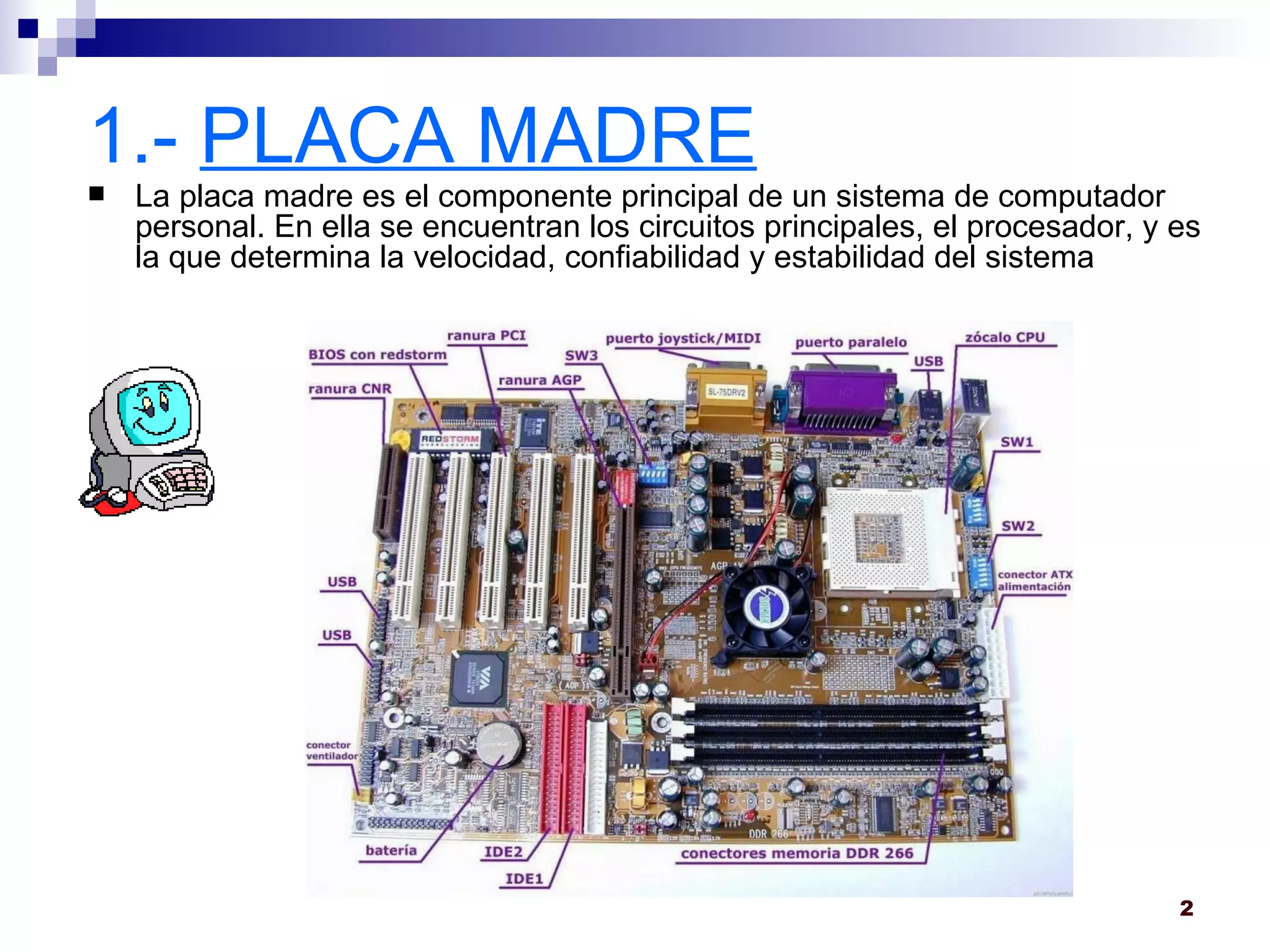 Este documento describe los principales componentes internos de una computadora personal. Estos incluyen la placa madre, que controla el procesador y determina la velocidad del sistema; el procesador, que controla las operaciones de la computadora; la fuente de poder, que distribuye energía a los componentes; la memoria RAM, que almacena temporalmente los datos durante el funcionamiento; el disco duro, que almacena de forma permanente los programas y archivos; y los puertos y tarjetas, que permiten la conexión de periféricos y administran el
