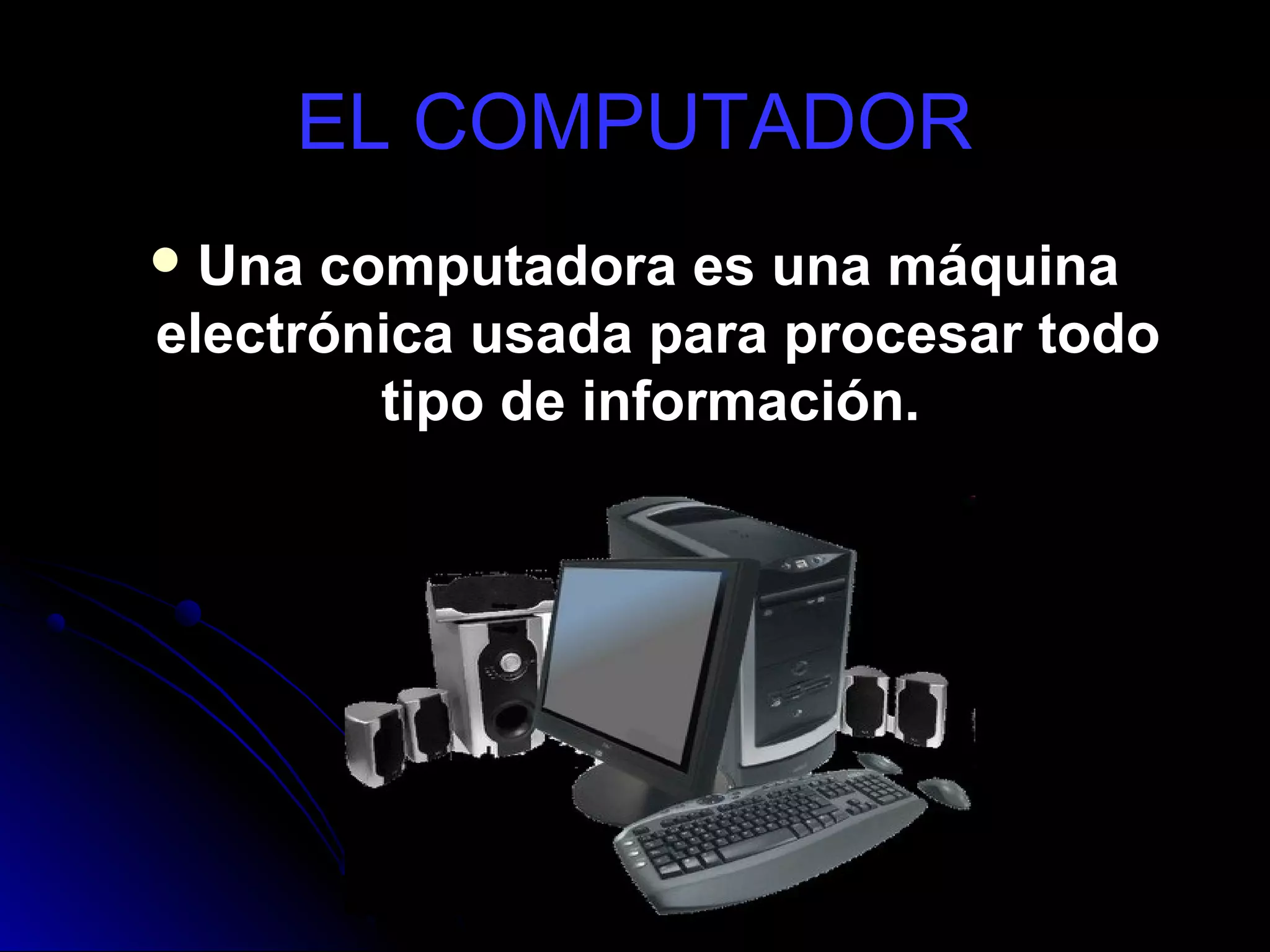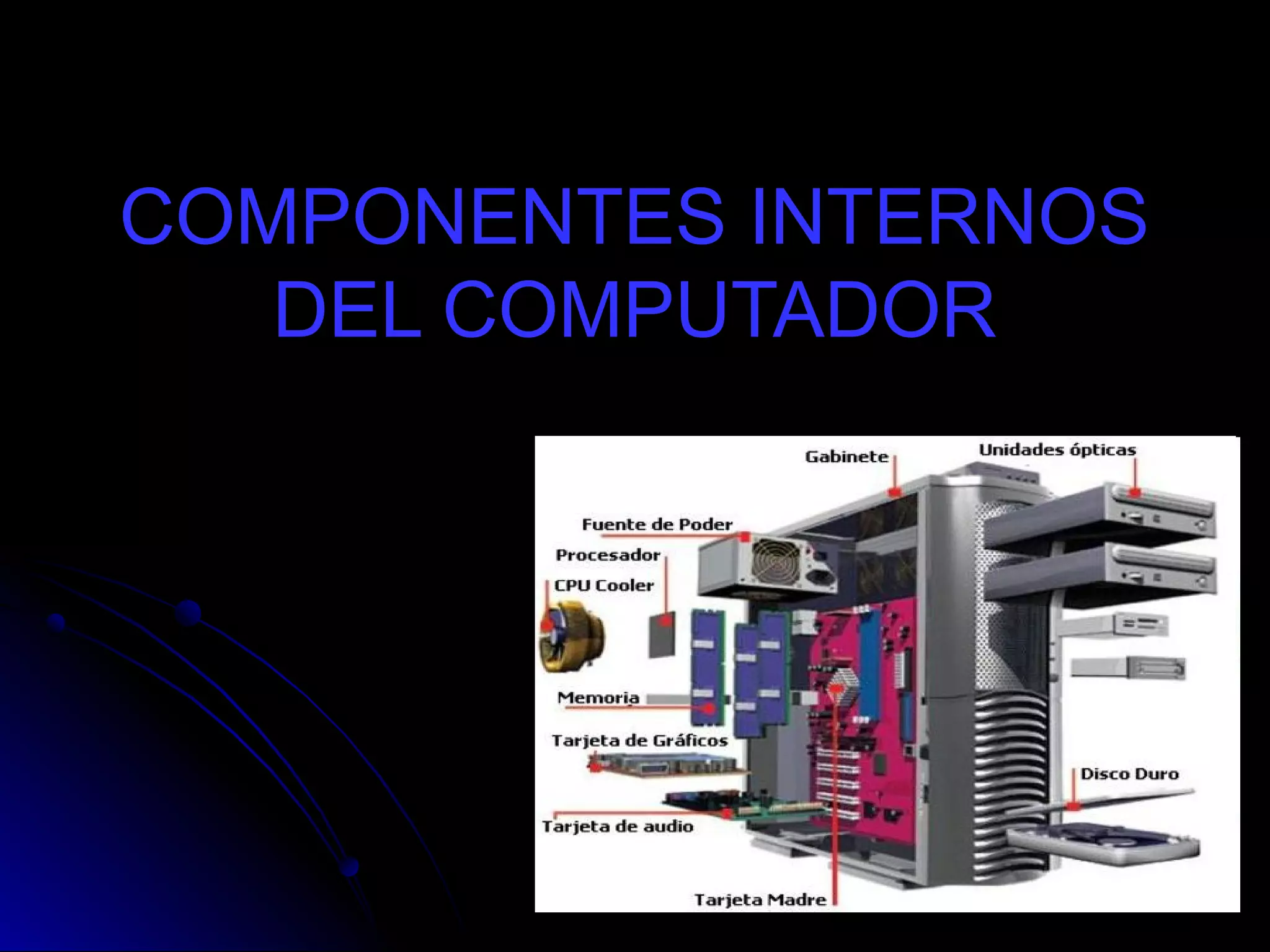 El documento describe los principales componentes internos de una computadora, incluyendo la tarjeta madre a la que se conectan las demás partes, el procesador que procesa las instrucciones y datos, la memoria RAM y ROM que almacenan información temporal y permanente respectivamente, la tarjeta de video que muestra la información gráfica en la pantalla, la tarjeta de sonido que maneja los sonidos, la tarjeta de red que conecta la computadora a una red, el disco duro que almacena programas y archivos de forma permanente, y la