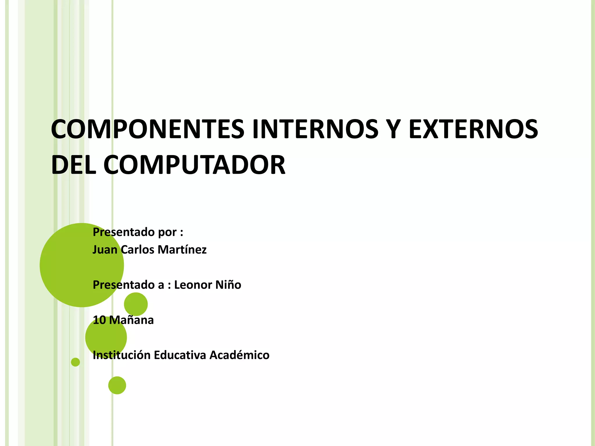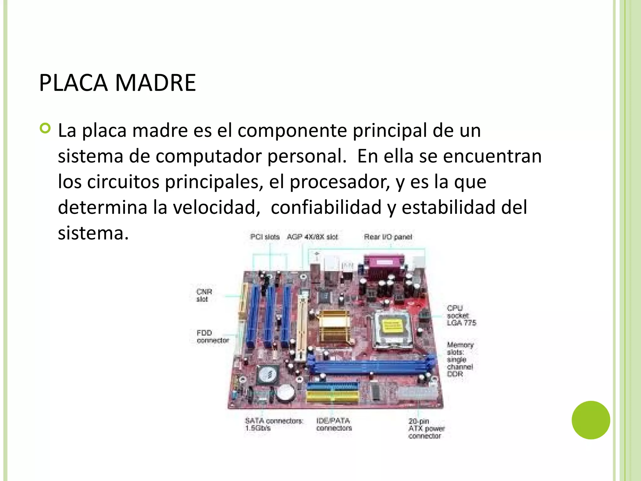 Este documento describe los principales componentes internos y externos de una computadora. Internamente, describe la placa madre, la memoria RAM y ROM, el disco duro, las tarjetas de video, sonido y red, los puertos, el procesador y la fuente de poder. Externamente, describe el mouse, la pantalla, el teclado y la cámara.