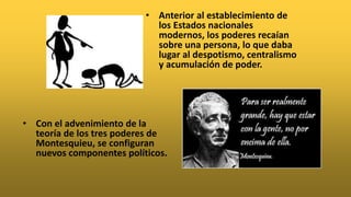 Los siete principales componentes políticos son: 1) el poder ejecutivo, encabezado por un presidente o primer ministro, 2) las instituciones políticas como defensorías y procuradurías, 3) las políticas gubernamentales y públicas, 4) la división política del territorio en distintos niveles, 5) la fuerza armada para hacer cumplir el orden, 6) las fronteras geográficas y administrativas, y 7) el poder legislativo encargado de hacer las leyes.