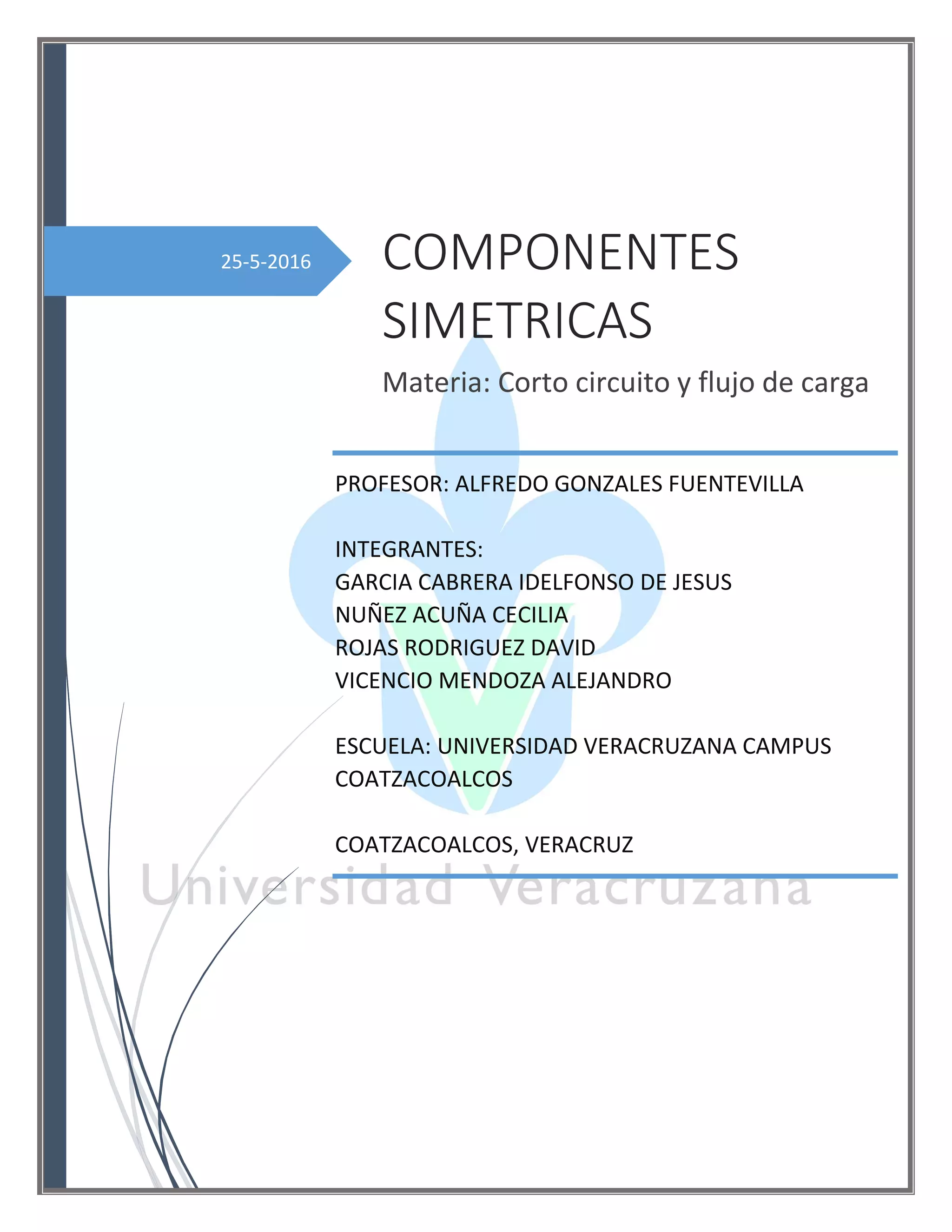 Este documento presenta el análisis de componentes simétricas para sistemas trifásicos desequilibrados. Introduce el método de componentes simétricas desarrollado por C.L. Fortescue en 1918 que permite descomponer un sistema trifásico desequilibrado en tres sistemas equilibrados llamados secuencia positiva, negativa y nula. Explica cómo resolver problemas de componentes simétricas utilizando el programa MATLAB, mostrando ejemplos numéricos de cálculo de corrientes y tensiones en componentes simétricas para un