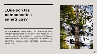 El documento explica el método de componentes simétricas desarrollado por Fortescue para analizar sistemas trifásicos desbalanceados. Este método permite descomponer voltajes y corrientes desbalanceadas en tres conjuntos de componentes balanceados llamados componentes de secuencia positiva, negativa y cero. Las componentes simétricas son útiles para el análisis de fallas asimétricas comunes en sistemas de potencia.