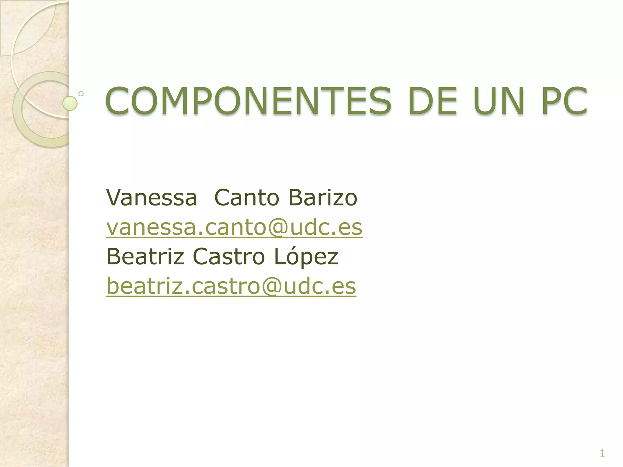 El documento describe los principales componentes de un ordenador personal (PC), incluyendo componentes externos como el monitor, teclado, ratón y la unidad central de procesamiento (CPU), así como componentes internos de la CPU como la tarjeta madre, memoria RAM, disco duro, procesador y fuente de alimentación. Explica brevemente la función de cada uno de estos componentes básicos para el funcionamiento de un PC.