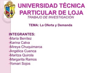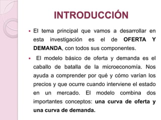 Este documento presenta un resumen del tema de oferta y demanda. Explica conceptos clave como curva de demanda, ley de la demanda, factores que afectan la demanda, curva de oferta, y punto de equilibrio del mercado donde se igualan la oferta y la demanda. El documento analiza estos conceptos teóricos y provee un ejemplo numérico para ilustrar el modelo de oferta y demanda.