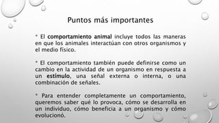Este documento trata sobre el comportamiento animal. Explica que el comportamiento animal incluye las interacciones entre animales y con su entorno, y que puede ser innato u aprendido. Describe cuatro preguntas clave para entender un comportamiento: su causalidad, desarrollo, beneficios y evolución. Utiliza como ejemplo la producción del canto en los pinzones cebra macho para ilustrar estas preguntas.