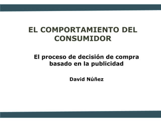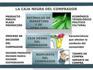 Este documento describe los diferentes factores que afectan el comportamiento del consumidor en el proceso de toma de decisiones de compra. Explica que los factores culturales, sociales, personales y psicológicos influyen en cómo los consumidores reconocen necesidades, buscan información, evalúan alternativas y toman decisiones de compra. Además, detalla las cinco etapas del proceso de decisión del comprador: reconocimiento de necesidades, búsqueda de información, evaluación de alternativas, decisión de compra y conducta posterior a la