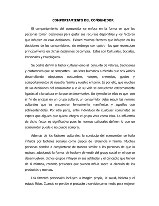Este documento describe los principales factores que influyen en las decisiones de compra de los consumidores: factores culturales, sociales, personales y psicológicos. Explica que la cultura, los grupos sociales de referencia, la personalidad, la edad y la opinión de otros afectan la percepción y comportamiento de los consumidores. También señala que es importante para las empresas comprender cómo estos factores influyen en el comportamiento cambiante de los consumidores para satisfacer mejor sus necesidades.