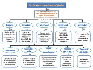 El documento presenta 10 principios para el uso responsable y respetuoso de las tecnologías de la información y la comunicación (TIC). Estos principios se dividen en 5 categorías: respeto a los demás, ejercicio de los derechos y libertades, uso seguro e identidad, protección e integridad, y uso responsable.