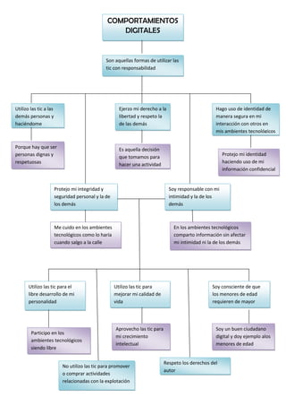 El documento describe comportamientos digitales responsables en 3 oraciones o menos. Enfatiza el uso responsable y respetuoso de las tecnologías de la información y comunicación (TIC), protegiendo la privacidad propia y de los demás, ejerciendo la libertad de forma segura y siendo un buen ciudadano digital.