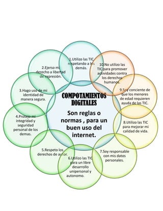 Este documento presenta 10 comportamientos digitales que promueven el uso respetuoso y responsable de las tecnologías de la información y la comunicación (TIC), incluyendo ejercer la libertad de expresión, proteger la seguridad e integridad personal y de los demás, respetar los derechos de autor y usar las TIC de manera segura y para mejorar la calidad de vida.