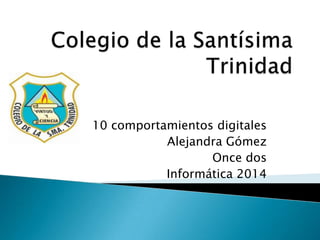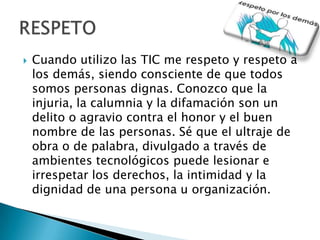 Este documento presenta 10 comportamientos digitales que promueven el respeto a los derechos y la dignidad de las personas en los ambientes tecnológicos. Estos comportamientos incluyen respetar la identidad y privacidad propia y de los demás, utilizar las tecnologías de forma responsable y para fines positivos como el desarrollo personal, y no participar ni promover actividades ilegales o que atenten contra los derechos humanos.