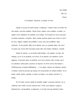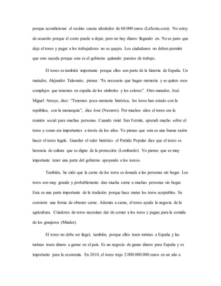 El documento discute las tradiciones de los toros en España y los argumentos a favor y en contra de su legalidad. A favor se argumenta que los toros son importantes para la historia y cultura de España, proveen empleos y beneficios económicos a través del turismo. En contra se argumenta que es un deporte cruel y que algunas ciudades han prohibido los toros. El autor concluye que los toros no deberían ser ilegales debido a su valor histórico y cultural para España y su contribución económica.