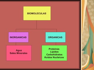 El documento describe las principales biomoléculas que componen las células, incluyendo biomoléculas inorgánicas como el agua y sales minerales, y biomoléculas orgánicas como proteínas, lípidos, carbohidratos y ácidos nucleicos. Estas biomoléculas cumplen funciones estructurales y funcionales clave en los organismos vivos.