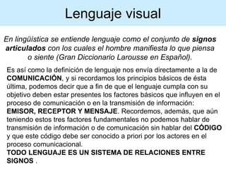 Este documento discute los conceptos de lenguaje visual y composición. Explica que un lenguaje es un sistema de relaciones entre signos y que la composición se refiere a cómo los elementos se distribuyen y organizan en el espacio de una obra. También analiza diferentes elementos composicionales como líneas, formas, tamaños y colores que pueden crear sensaciones como equilibrio, dinamismo o contraste.