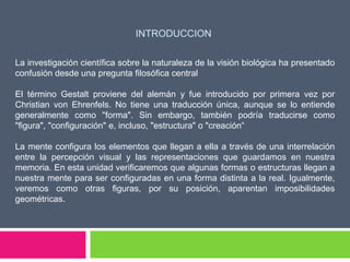 Este documento resume las principales leyes de la Gestalt en la composición bidimensional, incluyendo figura-fondo, positivo-negativo, continuidad, proximidad, cierre, comunidad, semejanza, simetría, contraste y experiencia. Explica cada ley a través de ejemplos de diseños creados usando formas geométricas y colores que ilustran cómo la mente humana tiende a organizar visualmente los elementos en nuestro campo visual.