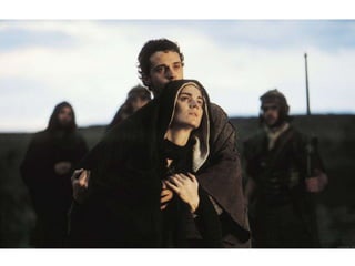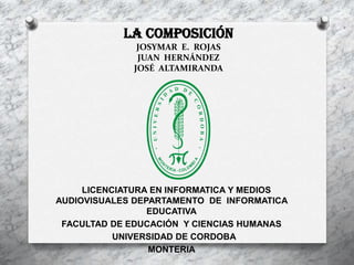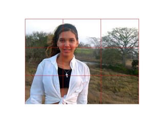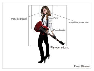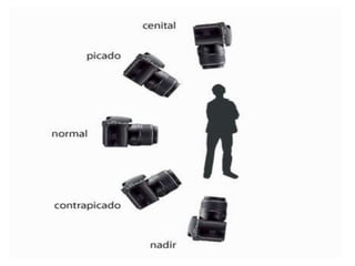 Este documento presenta una introducción a conceptos básicos de composición en fotografía y cine, incluyendo diferentes tipos de planos, ángulos de toma, movimientos de cámara, equilibrio, simetría, ley de tercios, compensación de masas, ritmo y textura.
