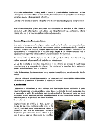 El documento describe diferentes técnicas fotográficas como el encuadre, la perspectiva, el enfoque, la iluminación y el movimiento. Explica que el encuadre determina qué parte de la escena se captura y que la regla de los tercios guía la composición. También habla del enfoque total y selectivo, y de cómo la perspectiva y el ángulo, como el picado o el contrapicado, pueden resaltar diferentes aspectos de lo fotografiado. Además, detalla cómo la luz y los colores