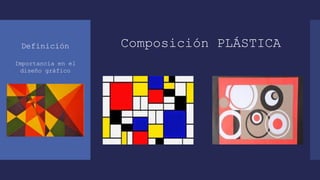 El documento define la composición plástica como la creación de una imagen utilizando elementos como formas geométricas que dan armonía y expresión personal. Explica que la composición plástica es importante en el diseño gráfico para crear una estructura estética y agradable. Luego describe cuatro tipos de equilibrio en el diseño: simetría, asimetría, equilibrio radial y equilibrio de mosaico. Finalmente, indica que analizará composiciones equilibradas utilizando figuras planas a color.