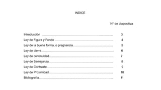 Este documento resume las principales leyes de la percepción visual conocidas como Leyes de Gestalt, incluyendo la Ley de Figura y Fondo, la Ley de Buena Forma, la Ley de Cierre, la Ley de Continuidad, la Ley de Semejanza, la Ley de Contraste y la Ley de Proximidad. Cada ley se explica brevemente con un ejemplo ilustrativo. El documento concluye con una breve bibliografía.