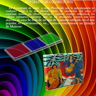 Este documento resume diferentes tipos de contrastes y armonías de color, incluyendo contraste de colores puros, contraste claro-oscuro, contraste cálido-frío, contraste de complementarios, contraste de cantidad, armonía monocromática, colores complementarios, dobles complementarios y triadas complementarias. Explica cómo estos diferentes enfoques afectan la saturación, luminosidad y temperatura de los colores.