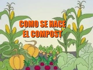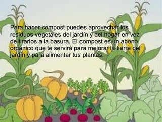 Este documento explica cómo hacer compost utilizando residuos orgánicos del jardín y el hogar. Se recomienda construir un montón o usar un compostador prefabricado y agregar materiales como hojas, césped, ramas podadas, residuos de comida y papeles. El compost mejora la tierra y nutre las plantas, por lo que es una alternativa mejor que desechar los residuos orgánicos.