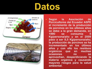 El incremento en la producción de porcinos en Ecuador ha generado un aumento de residuos orgánicos, cuyos subproductos pueden ser aprovechados mediante la elaboración de compost, lo que mejora la calidad del suelo y promueve una agricultura sostenible. Se presentan tanto ventajas, como el fomento de microorganismos benéficos, como desventajas, incluyendo la larga transición necesaria para la conversión a suelo orgánico. Además, el análisis químico muestra que el compost derivado de estiércol tiene un perfil nutricional favorable, benefició económicamente al productor y sugiere continuar investigando otros materiales biodegradables para mejorar la calidad del compost.