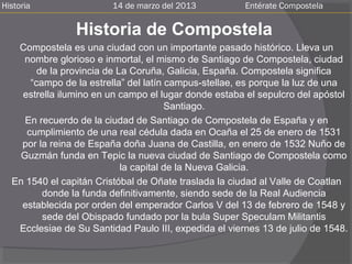 Este documento proporciona información sobre la historia, geografía, clima, recursos naturales, actividades económicas y atractivos turísticos de Compostela, Nayarit. Compostela fue fundada en 1532 por orden real y se destaca por su rica biodiversidad, playas de gran belleza y una gastronomía basada en mariscos y frutos del mar. El turismo es una importante fuente de ingresos debido a sus atractivos naturales, históricos y culturales.
