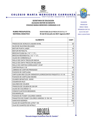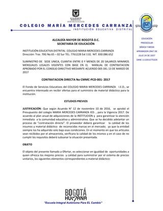 Este documento describe un proceso de contratación directa para suministrar material didáctico al Colegio María Mercedes Carranza en Bogotá. Se enumeran los elementos que se requieren, el presupuesto disponible, los plazos de entrega y pago, y los requisitos para la presentación de ofertas. El objetivo es seleccionar al proveedor que ofrezca los mejores precios y calidad para proveer los insumos educativos enumerados.