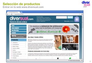 El documento proporciona un manual paso a paso para realizar una compra en la tienda online Diversual, incluyendo seleccionar productos, añadirlos al carrito, confirmar la dirección de envío y realizar el pago para completar la transacción.