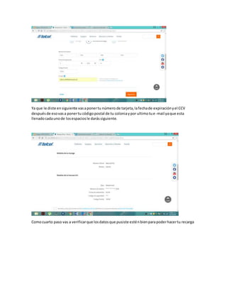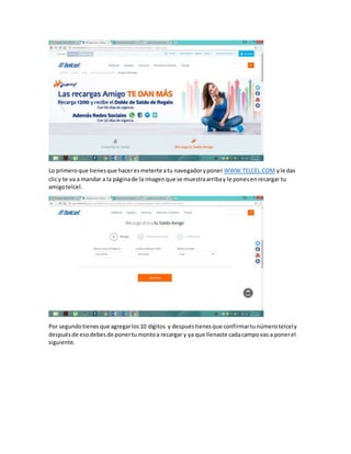 El documento proporciona 5 pasos para recargar un número Telcel en la página web de Telcel: 1) Ingresar a www.telcel.com, 2) Agregar el número Telcel a recargar y confirmarlo, 3) Ingresar los detalles de pago, 4) Verificar los datos, y 5) Aceptar los términos y confirmar el pago. Una vez completado, se recibe un mensaje con la cantidad recargada en el número Telcel.