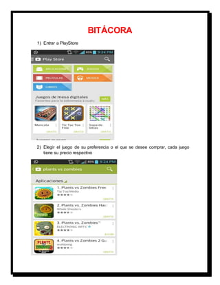 Este documento describe los pasos para realizar una compra a través de la tienda de aplicaciones PlayStore en un teléfono celular. Los pasos incluyen seleccionar un juego, hacer clic en "comprar", seleccionar un método de pago como tarjeta de crédito o débito, ingresar los detalles de la tarjeta, proporcionar información del titular de la tarjeta, descargar e instalar el juego en el celular.